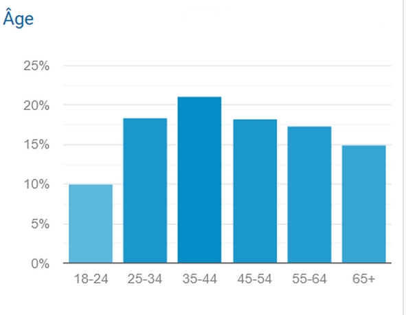 La tranche d’âge 35-44 ans est la plus importante, avec 21.10 % des lecteurs ; suivie par les 25-34 ans, 18.42 % ; puis les 45-54 ans, 18.26 % ; les 55-64 ans, 17.32 % ; les plus de 65 ans, 14.91 % et enfin les plus jeunes, 18-24ans, 10.00 %.