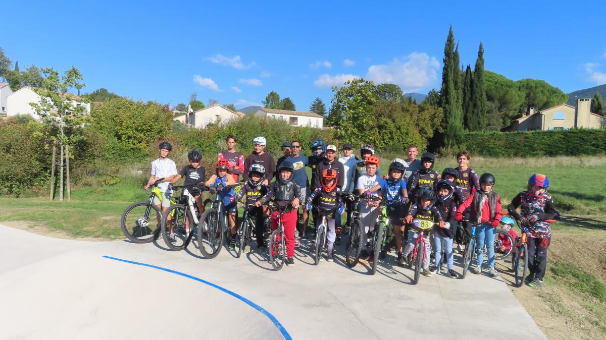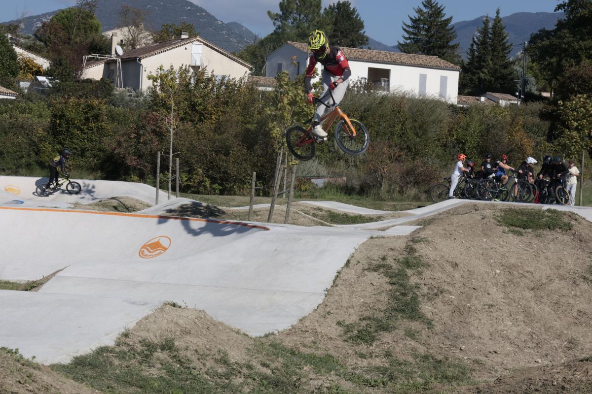 Lors des discours, Frédéric Tenon n’a pas manqué de remercier l’État représenté par Philippe de Brion pour son aide financière de 20 000 €, sachant que le coût total des travaux se montent à 73 000 € HT (1ère tranche de 12 000 € HT et la 2ème tranche 61 000 € HT). Il remerciait également Alix Collot dont l’entreprise a réalisé le bétonnage de la piste avec 8 virages relevés sur une longueur de 250 m. Travaux qu’il a réalisé grâce à sa parfaite connaissance des pentes et arrondis de ce genre de piste, étant lui-même champion de BMX Cruisers 30 ans et +. Le maire soulignait et remerciait aussi l’association Ventoux Trial Classic et son président Thierry Aubert pour avoir financé les barrières autour du circuit. Ce moment inaugural avait réuni de nombreux riders venus en voisins du BMX Club d’Entrechaux dont le Malaucénien Quentin Jean, pilote national catégorie 17/24 ans. Tous s’en sont donnés à coeur joie, que ce soient les plus aguerris comme les plus petits avec leurs draisiennes.