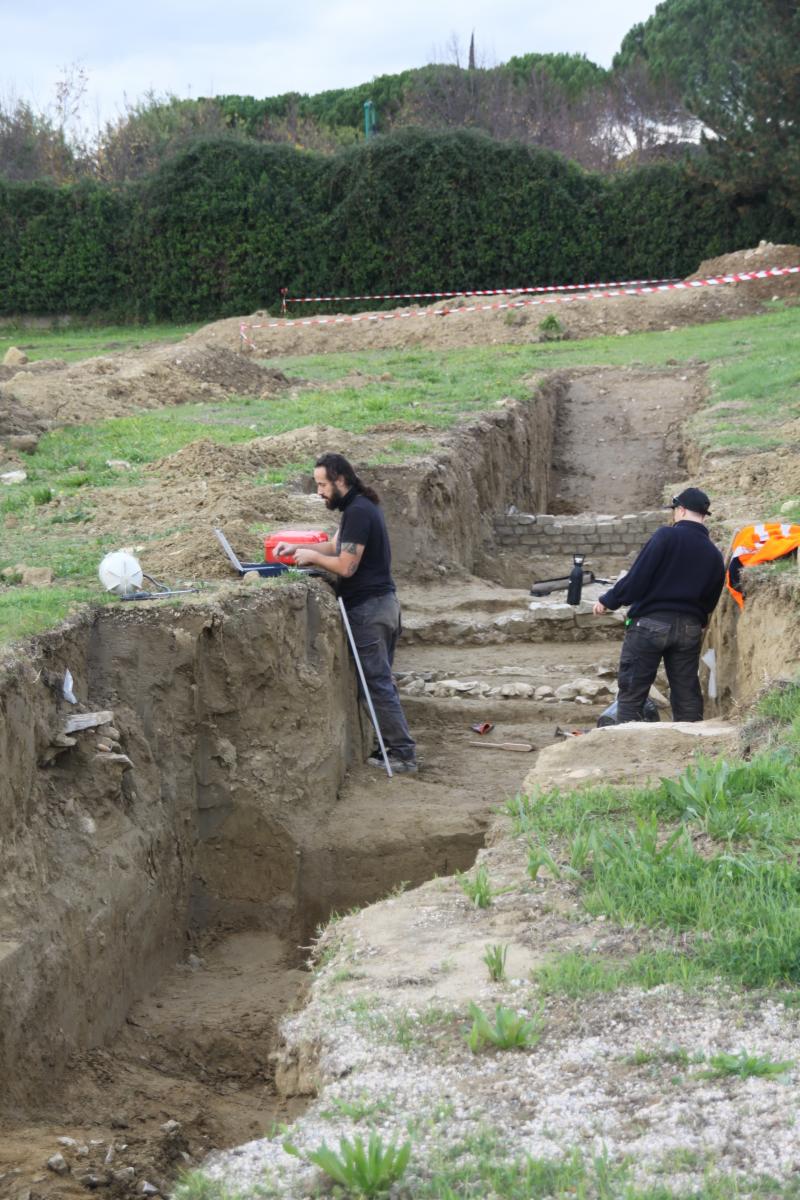 Ce terrain est municipal, il sert de parking, et ce diagnostic fait suite à une demande de la ville non motivée par un souhait d’aménagement de la parcelle. Ce site a été choisi car il se situe entre les thermes du Nord et le théâtre antique, un secteur où des fouilles ont déjà été entreprises en 2020 et 2022. Un diagnostic avait été réalisé sur une parcelle face au théâtre, ainsi que des fouilles en face des thermes du Nord qui ont montré une jonction de voie de circulation, c’est un secteur avec des monuments publiques majeurs.