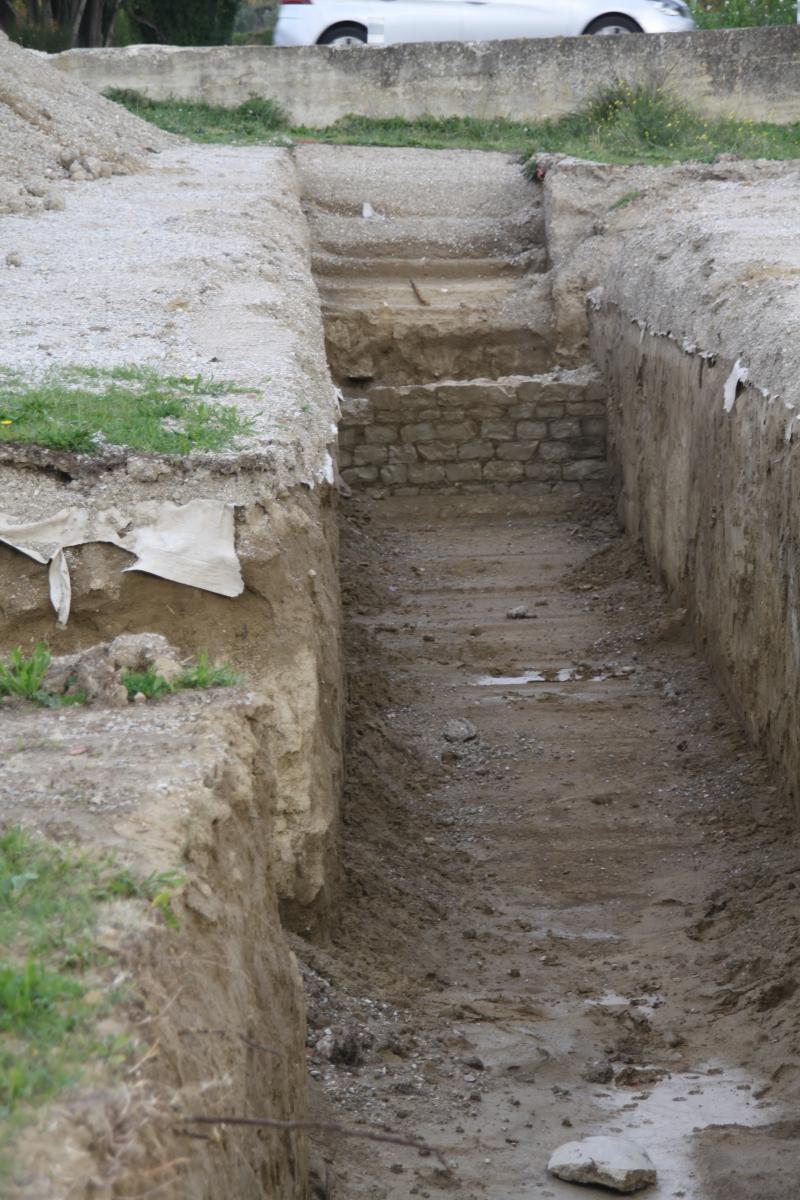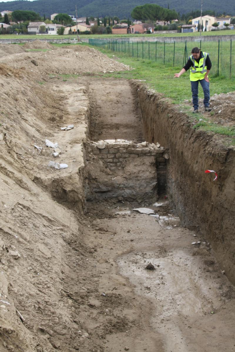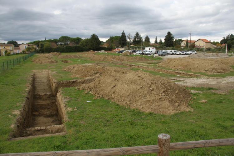 Il a été creusé 500m² de tranchées qui ont montré de gros égouts ou un réseau pluvial et, au-dessus existent des murs monumentaux adossés à la pente puisque ce terrain à l’époque était en bas d’une pente située au nord. Par ailleurs il se dessine un bassin monumental le long de l’aire des campings cars qui pourrait avoir un rapport avec les thermes situés à proximité. C’est l’hypothèse majeure d’une possibilité d’une construction formant un complexe d’une nature indéterminée d’une taille pouvant recouvrir le parking des campings cars ainsi que le terrain en cours de fouilles et qui s’intégrerait avec les thermes du nord.