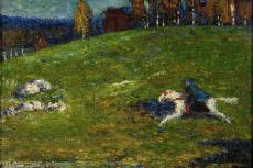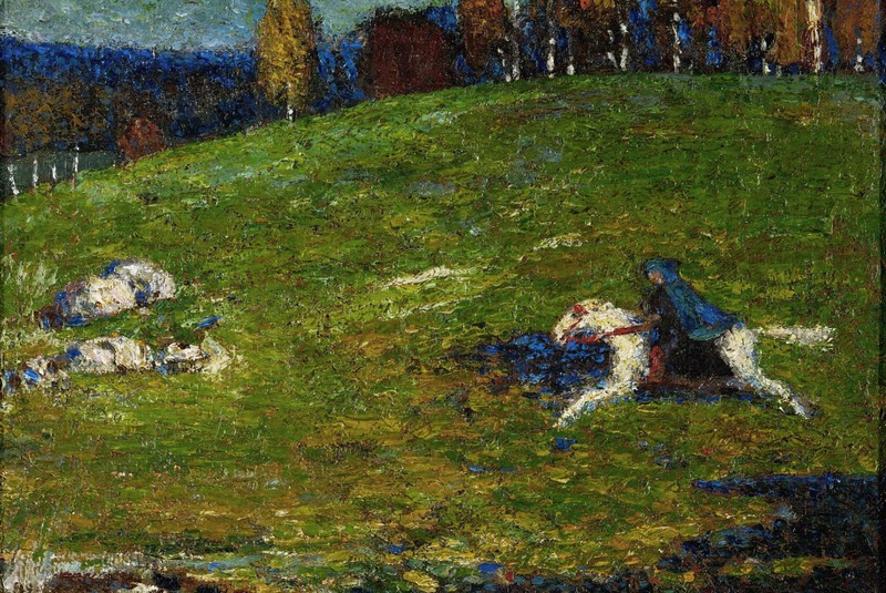Der Blaue Reiter de Wassily Kandinsky, réalisée en 1903 (fragment). Ce tableau a donné son nom au groupe avant-gardiste fondé par Kandinsky et Franz Marc en 1911.