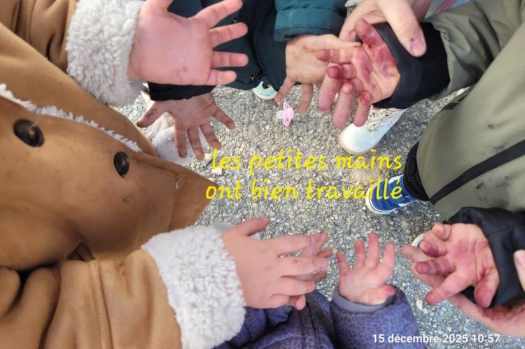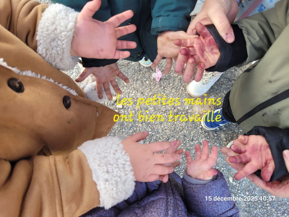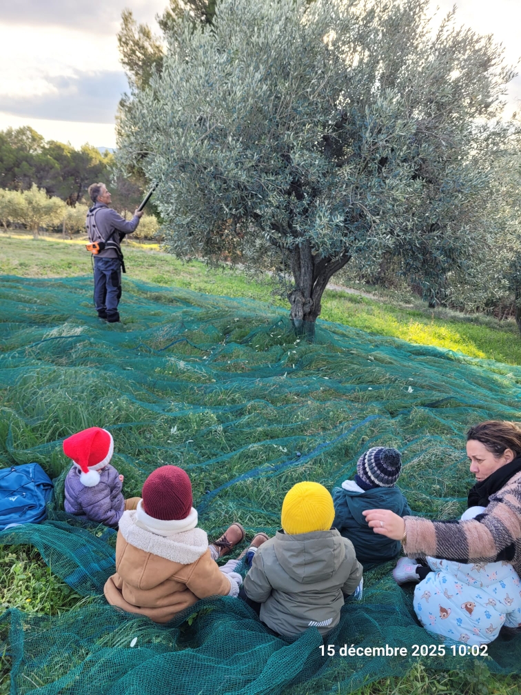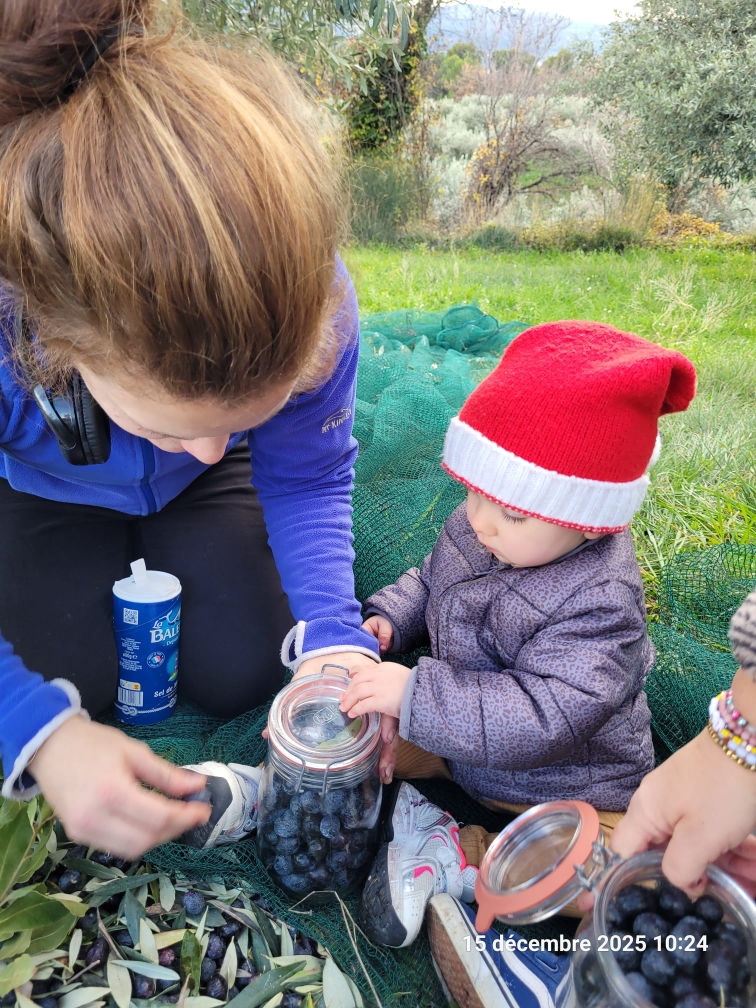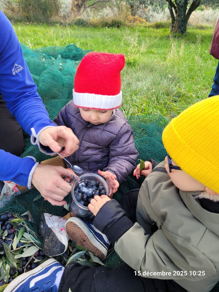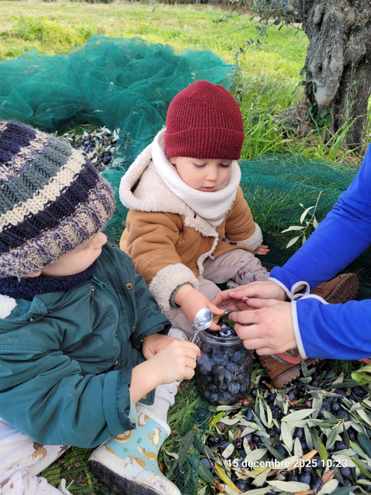Ce Lundi 15 Décembre, les enfants de l'association nounous et bouts d'choux avec leurs assistantes maternelles, Babeth et Nathalie, ont été reçus par Aurélie et son papa Guy sur le Domaine La Fille des Vignes où une belle et nouvelle activité leur a été réservée. Ils ont effectué une belle cueillette d'olives et assisté à une démonstration de ramassage au râteau, démonstration à laquelle les nounous se sont essayées. Les olives ramassées Marius, Charli, Jade, Lucia et Léandre ont trié leur récolte puis mis en bocaux avec du sel et du laurier. Le plus long sera d'attendre 6 petits mois avant de les déguster mais nous sommes certains qu'elles seront délicieuses.