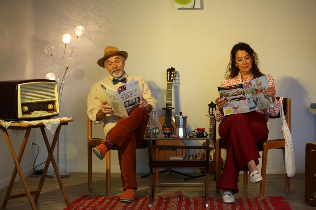 A travers leurs compositions originales, deux amoureux de notes et de mots nous parlent de la place de la chanson dans nos vies : l’enfance, la rencontre, le temps qui passe, les copains… Un vieux poste de radio ponctue cette conversation amoureuse d’extraits de chansons caustiques (Aznavour, Ferré, Vian, Brassens, Bardot...).