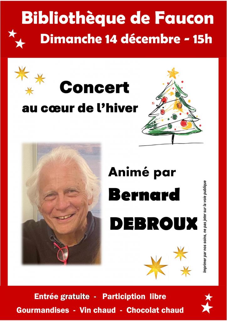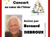 En effet, Bernard Debroux nous embarquera pour un concert « Au cœur de l’hiver ». Accompagné de sa guitare, il vous proposera des chants d’hiver, de neige, mais aussi de Noël dont certains prévus pour que vous puissiez chanter avec lui. Il vous réserve aussi quelques surprises dont je ne peux pas vous parler car je ne les connais pas.