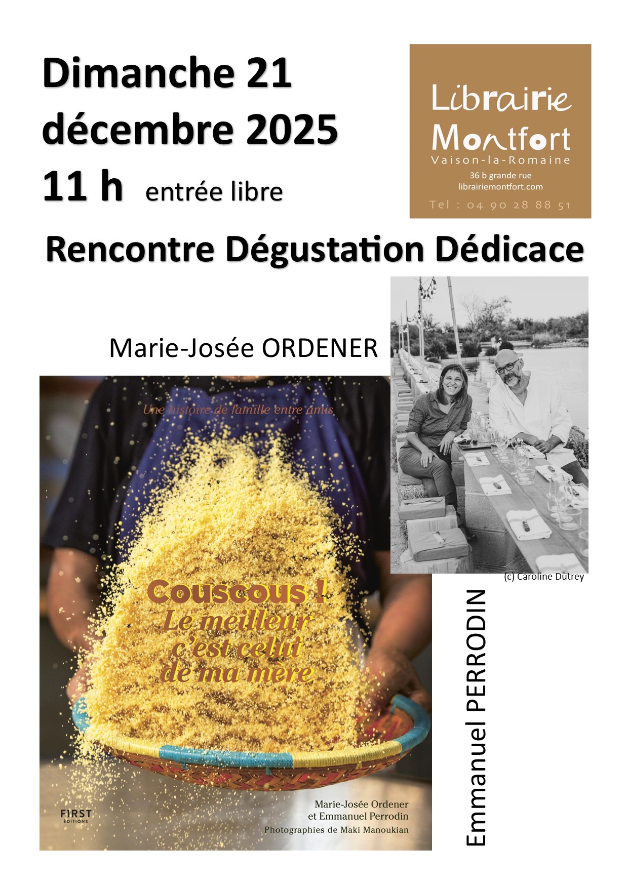Nous recevons Marie-Jo Ordener et Emmanuel Perrodin pour leur livre sur le couscous. Un moment fort rencontre une heure en librairie à 11 h et 12 h avec dégustation devant le librairie.