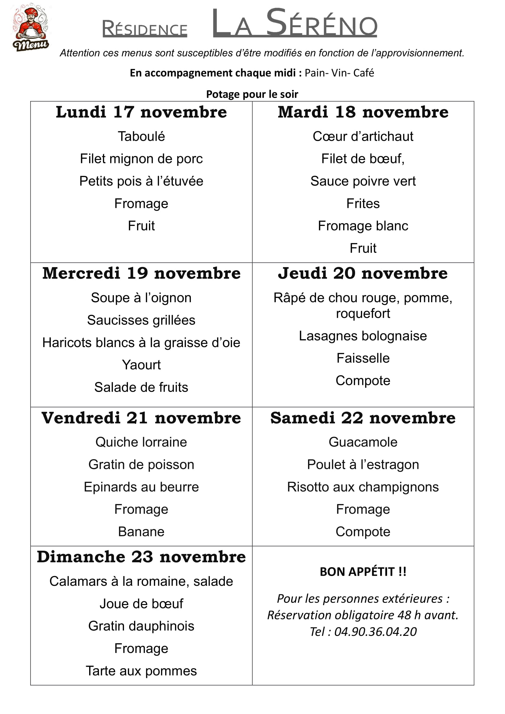 Il faudra réserver obligatoirement 3 semaines avant et tout repas réservé sera considéré comme dû.