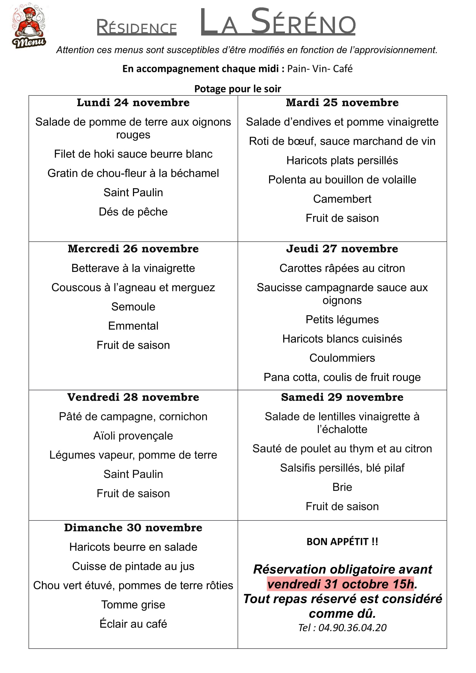 Il faudra réserver obligatoirement 3 semaines avant et tout repas réservé sera considéré comme dû.