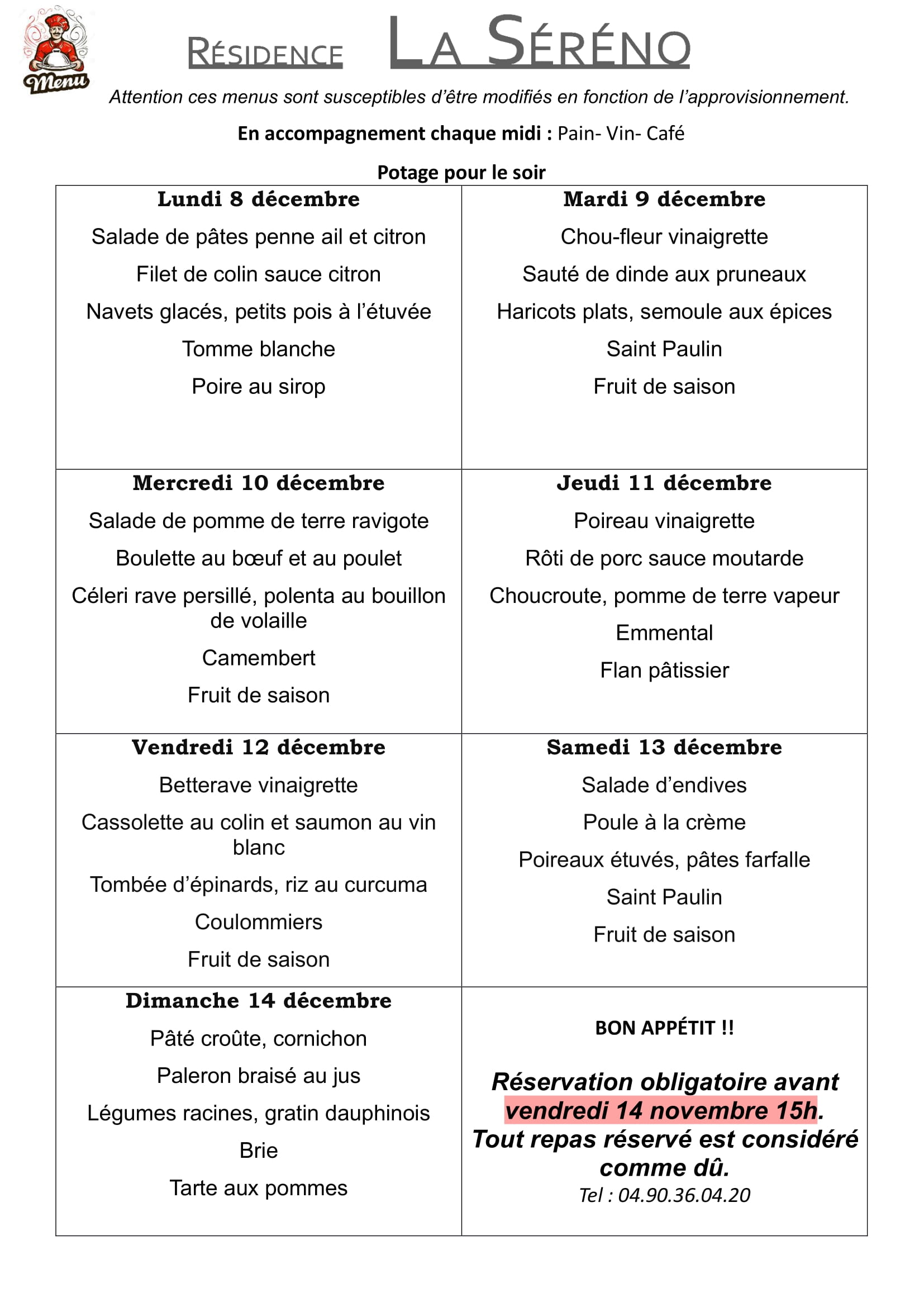 Il faudra réserver obligatoirement 3 semaines avant et tout repas réservé sera considéré comme dû.